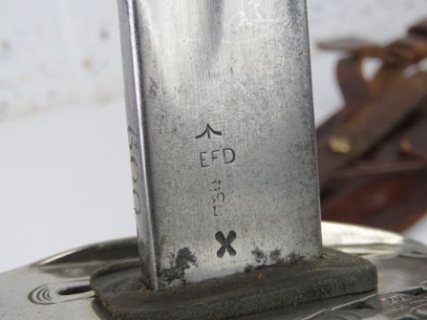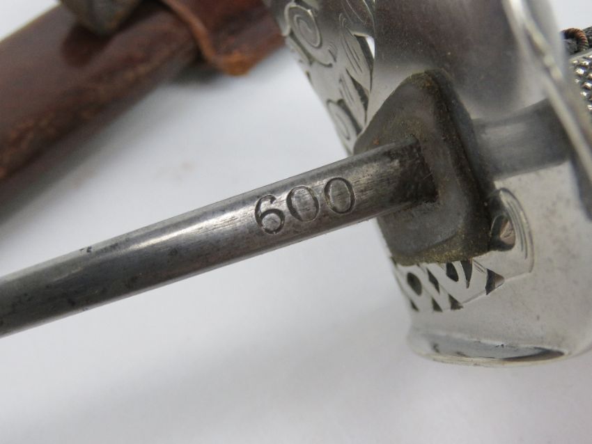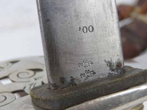A Sergeants sword made in 1900 with a 45' pattern style blade. Stamps of '00 made by Enfield 'EFD' with Enfield inspection inspection marks, George V 1897 pattern hilt with scabbard, field knot and frog.