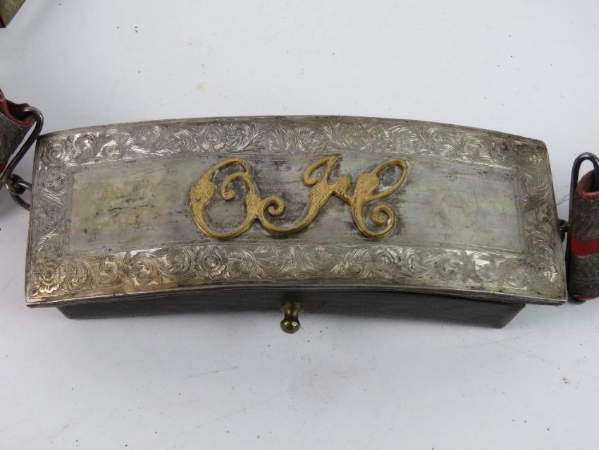 A late 19th century Victorian Officer's Full Dress Cross Belt and Pouch, the red morocco belt with silvered embroidery centred by a red strip, foliate engraved floral boss and buckle, chains and arrow pickers (slightly a/f), pouch having applied gilt lettering, no apparent hallmark. Together with a 19th century black and gilt thread military ceremonial sash waist belt. Footnote; Found with the property of Samuel Bowen Partridge b.1823 d. 1898 Deputy Surgeon General - Bengal Army Medical Service and Companion of the Most Eminent Order of the Indian Empire. Copy biography of Samuel Bowen Partridge available on request.