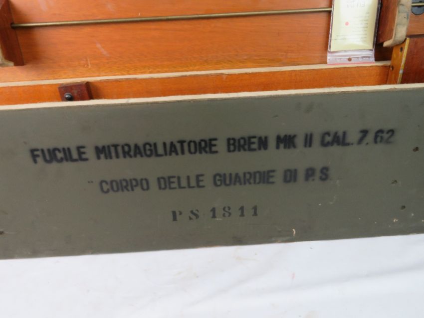 A deactivated Italian Breda Bren .30-06 Calibre Light Machine Gun. Matching Numbers, BMB - Breda Meccanica Brescia manufacture and post war dated. Having with Transit Chest, Spare matching number Barrel, 12 x Magazines in Box and Cleaning Rod, with moving trigger, selector, cocking handle (under spring pressure). With certificate.