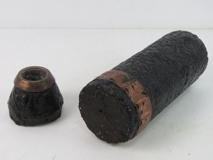 An inert WWI Shell head with a dual drive band, repainted. Together with an inert WWI 18pr shell head. Two items.