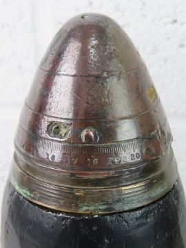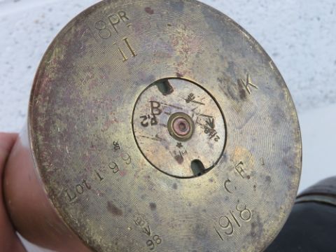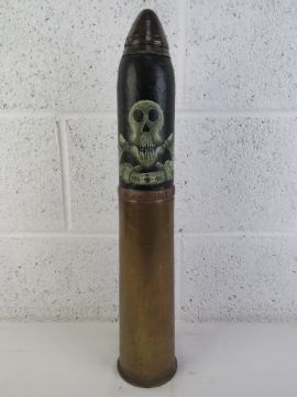 An inert WWI British 18pr skull design trench art shell, dated 1918 with Broad Arrow upon, fuze unscrews.