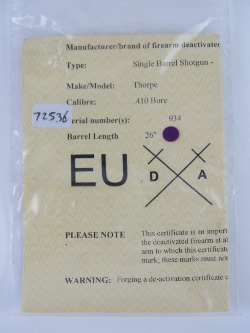 A deactivated English G Thorpe Bartram of Braintree .410 Gauge Single Barrel Shotgun. Latest EU spec moving trigger, safety, and opening barrel. With certificate.