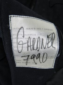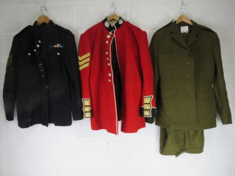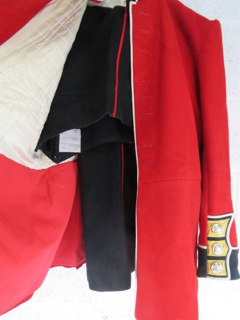 British Army No2 Dress uniform, Scots Guards band tunic, Scots Guards No1 Dress, and other items of uniform including buttons and badges.
