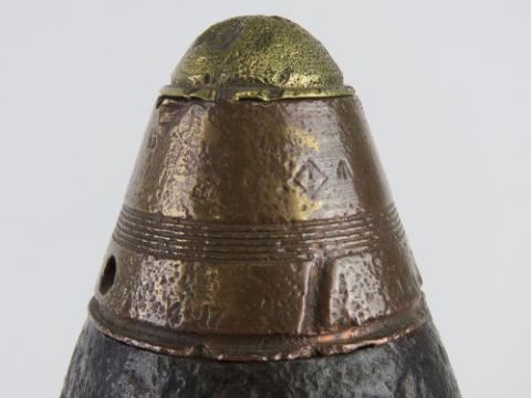 An inert WWI British 4.5cm Howitzer shell, casing, fuze and primer dated 1917, Approx. 42cm tall.
