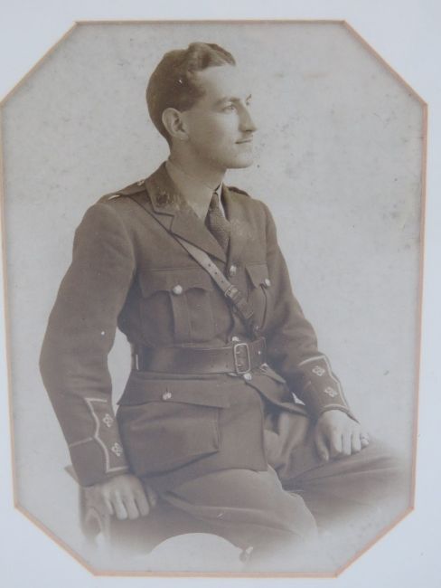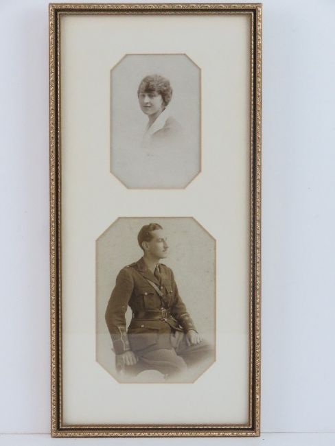 A WWI photograph; portrait of a Lieutenant in pre 1917 uniform, military provost collar badge, female portrait over, in later mount and frame, overall 18 x 37cm.