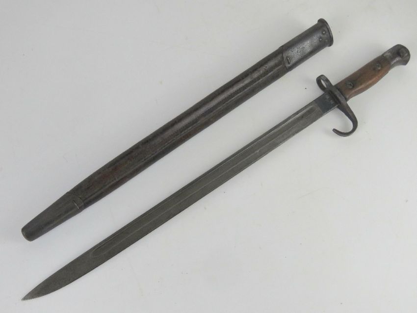 An SMLE 1907 Hook Quillon bayonet with scabbard, 1910 dated with the makers Sanderson.