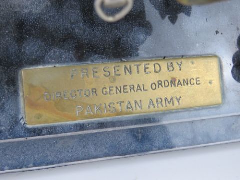 A metal model of an artillery cannon 'Presented by Director General Ordnance Pakistan Army', base measuring 28x 20cm.