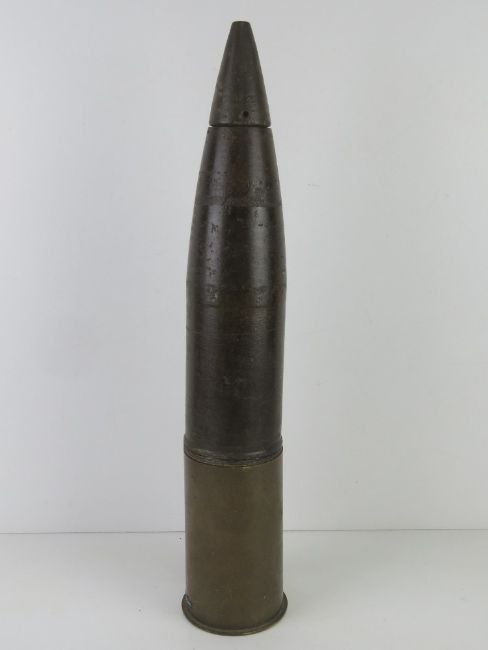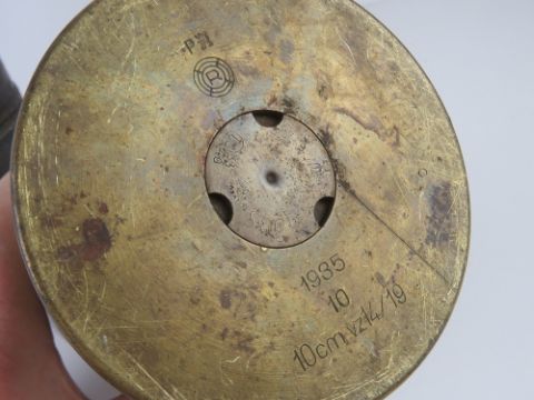 An inert German 10cm K18 Cannon shell and head, dated 1935, with original stencilling on the head, the AZ23 fuze dated 1943 with makers mark and German military stamp upon.