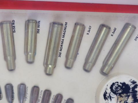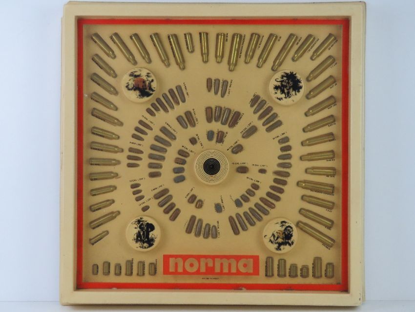 Norma 125 x inert cases and projectiles in display case ranging from .25 ACP, .38 SPECIAL, 8X57 etc.