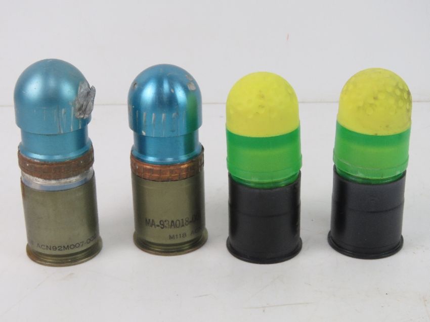 Two inert Swiss B&T (Brüger & Thomet) 40x46mm 'SIR' Anti-Riot Baton Rounds, together with two inert 40MM X 53 Practice Grenades S415A.