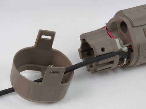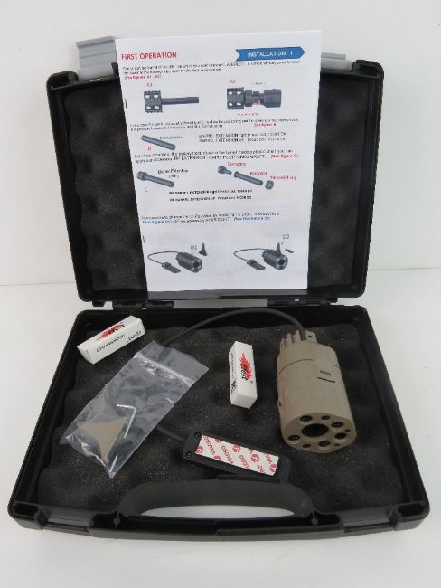 A Tactical torch and laser with pressure pad in box, with spare batteries, and accessories, comes with instructions, desert colour.