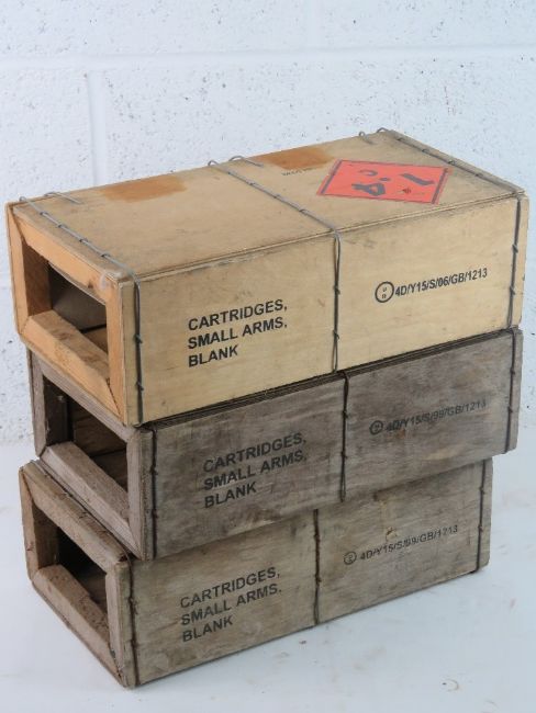Three British 5.56 blank wooden ammo boxes, with original stencilling.