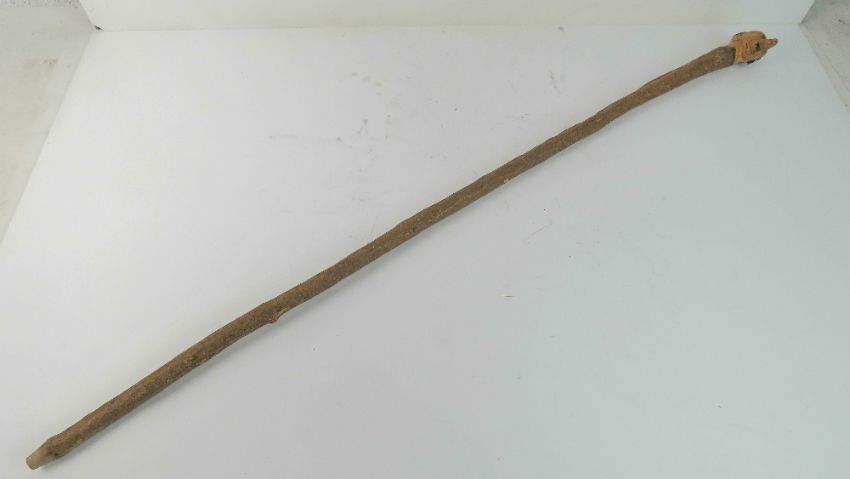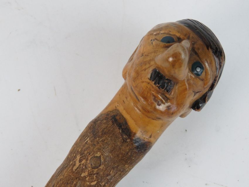 Military Folkart walking stick - a mid century carved and coloured Ash walking cane , the pommel formed as the head of World War II ( WW 2) German politician and Nation Socialist German Workers' Party leader Adolf Hitler. Formally belonging to a military collector. 37 1/4" ( 94.6 cms) long
