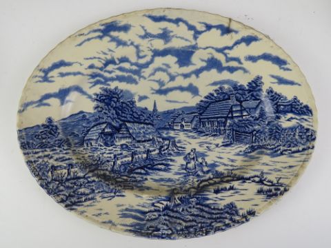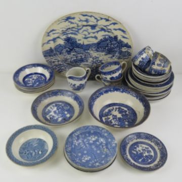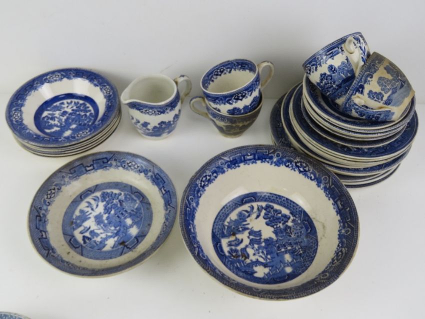 A quantity of blue and white ceramics, mostly Old Willow pattern.
