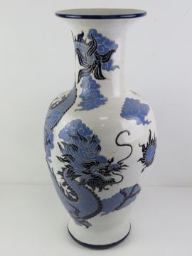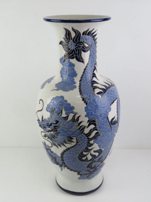A large floor standing white ground vase having blue Chinese dragon design, 65cm high.