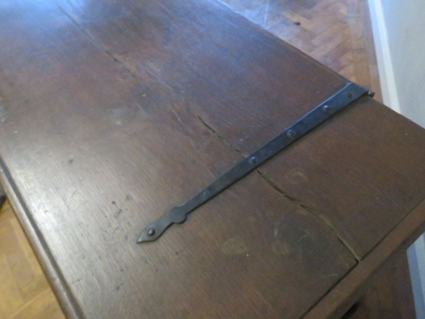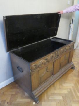 A fine and impressive late 17th / early 18th Century oak marriage chest, carved and decorated to the front, lid lifting to reveal compartment within, complete with candle box and having naïve blacksmith made end handles and strap hinges, 135 x 62 x 71cm.