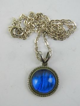 A vintage Art Deco butterfly wing pendant on silver chain.