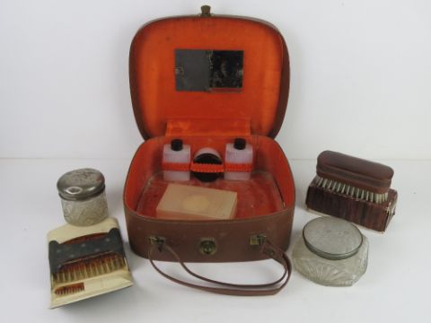 A vintage travelling vanity case with accessories.