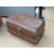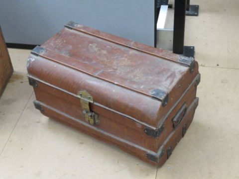 A metal trunk, two vintage suitcases and a vintage tea crate. Four items.