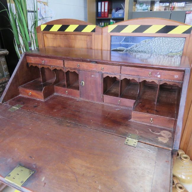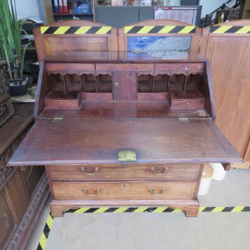 A late Georgian Walnut fall front bureau, lid lifting to reveal drawers and pigeonholes within, two short over three long drawers, all with brass drop handles, raised over bracket feet, 42" wide, 22" deep, 44" high.