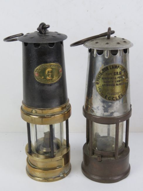 Two decorative Miners lamps 'Patterson Lamps Ltd' and 'Protector Lamp & Lighting Co Ltd Eccles', each standing approx 25cm high with hook over.