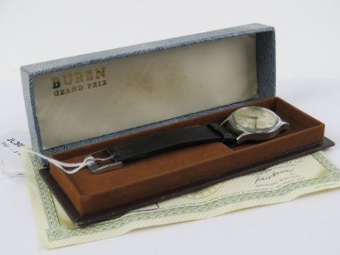 A vintage Buren wristwatch having receipt dated 1958, within original box. On replacement black leather watch strap.