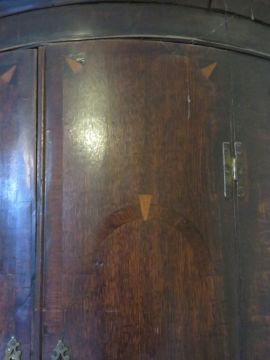 A Georgian barrel fronted hanging corner cabinet. Inlaid doors, pierced brass escutcheon plates, original H shaped hinges and doors opening to reveal shelves within 106cm (H), slightly a/f