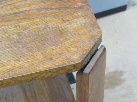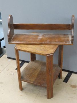 An Art Deco octagonal oak side table, a/f, 41 x 41 x 55cm, together with a wall shelf 65cm wide. Two items.