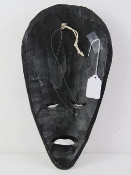 A carved and ebonised wall mask having Aboriginal type dot paint Pointillism decoration upon, 33cm in length.