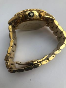 An Emporio Armani gold plated gentleman's wrist watch. Luminous baton hands, black ground dial, subsidiary splits dials, date aperture and heavy gold plated articulated strap. 42mm face diameter.
