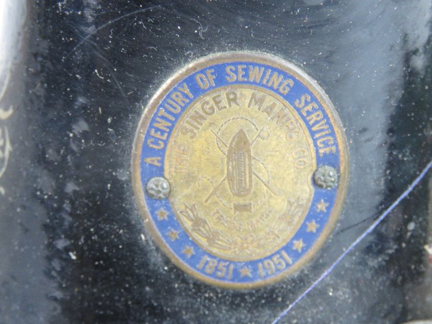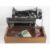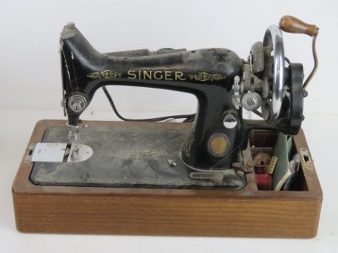 A Singer sewing machine in original case with Singer rubberised mat and cardboard box of accessories including feet.