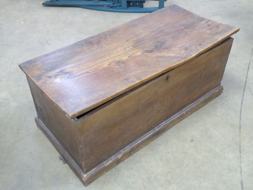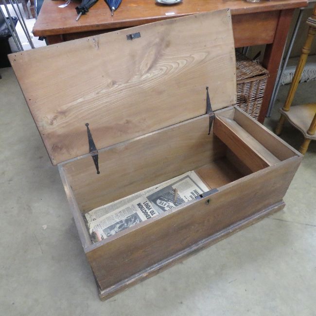 A pine lidded blanket box, lid a/f, 90cm wide.