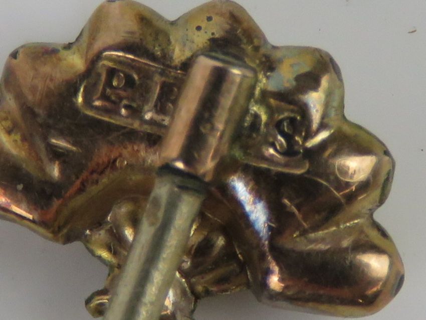 A yellow metal hunting brooch stock pin having horseshoe design. Together with a yellow metal cravat pin in vintage leatherette box.