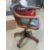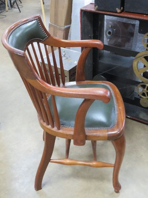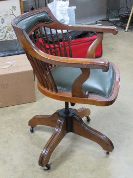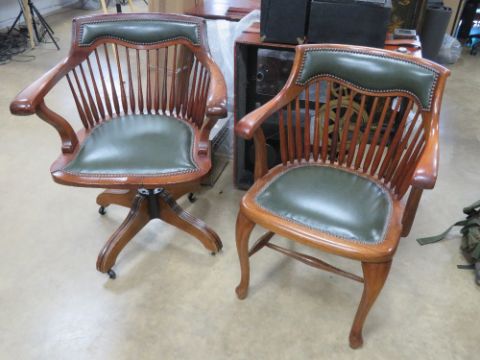 A green leather swivel chair raised over replacement castors with tilt function. Together with a matching office chair.