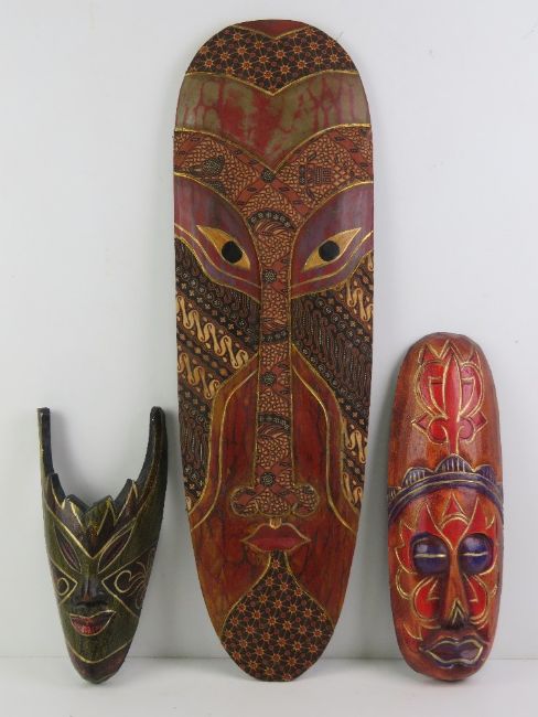 Three contemporary hand painted decorative wall masks, the largest having applied fabric decoration upon.