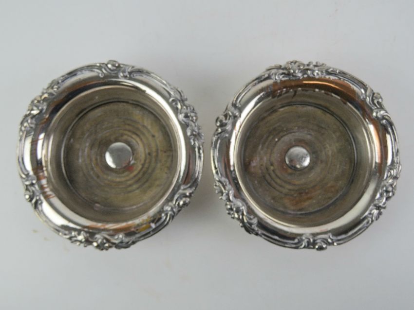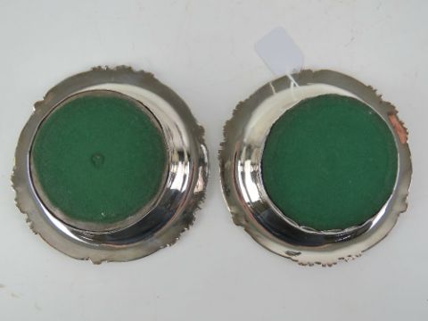 A pair of ornate silver plated wine coasters, 17.5cm dia.