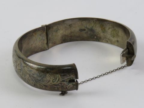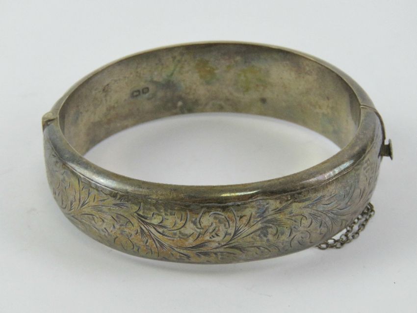 A HM silver hinged bangle having floral engraved decoration, hallmarked for chester, 6.2 x 5.4cm int dia, 28.12g.