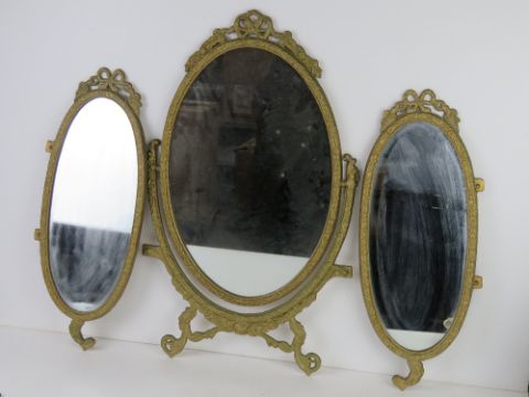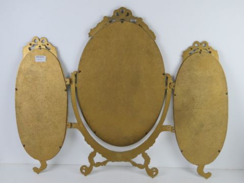 A brass framed tryptic dressing table mirror aperture, 62cm at highest.