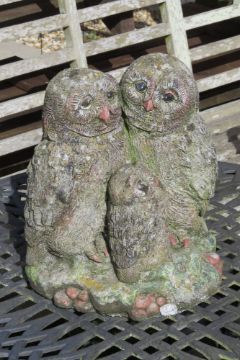 A pre-cast and painted garden statue of three owls standing 32cm high.