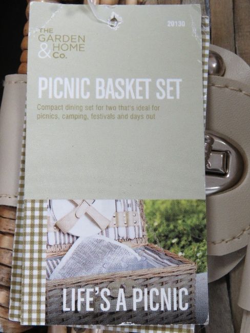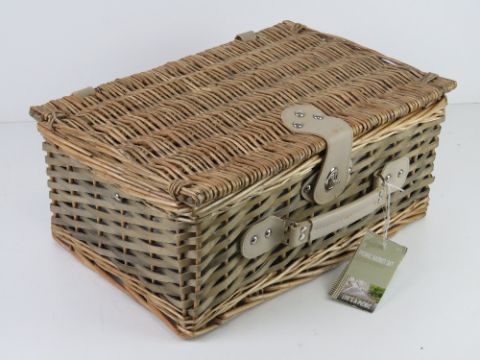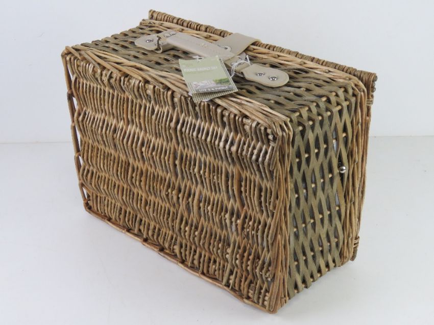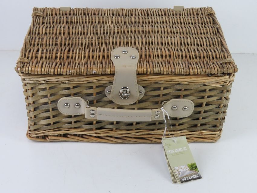 An as new wicker picnic hamper for two including thermal lining, cutlery, plates, bottle opener, etc. 41 x 27 x 18.