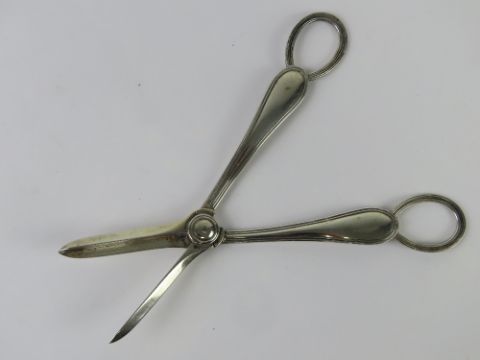 A pair of HM silver grape scissors made by Thomas Bradbury and Sons Ltd, hallmarked Sheffield 1906, 105.9g.