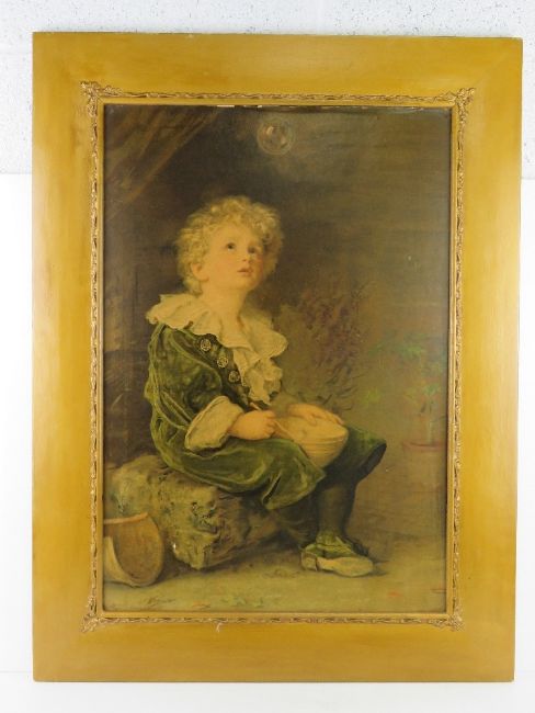 A large print 'Bubbles' featuring young boy fascinated by soap bubbles in gold painted wooden frame Overall size 67 x 89cm.