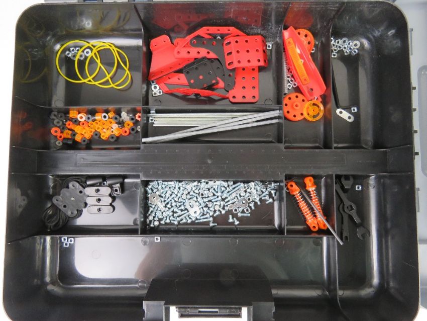 A quantity of contemporary Meccano in plastic Meccano carry case.