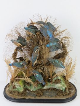 A Victorian hemispherical glass dome display case on fitted ebonised four footed stand, containing eight taxidermy kingfishers in naturalistic setting, 53 x 46 x 21cm. Taxidermy slightly a/f.