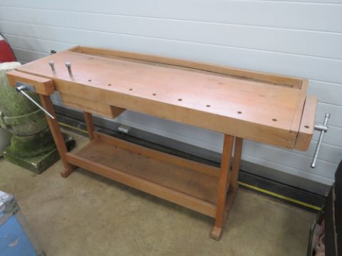 A contemporary workbench having central drawer and two integral vices. Overall approx 160 x 60 x 86cm