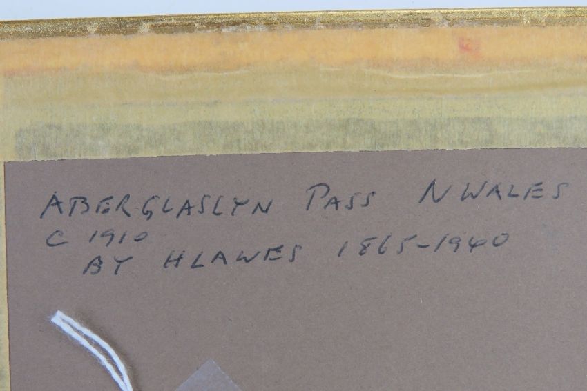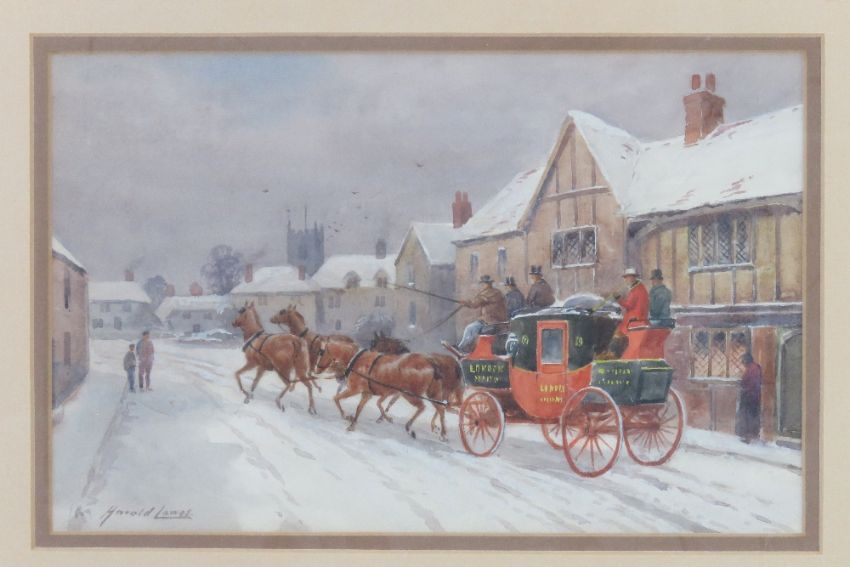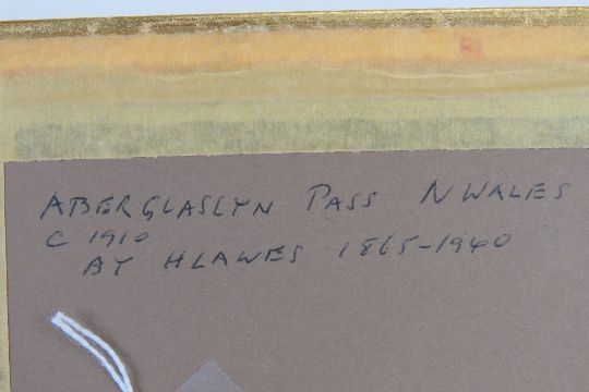 Two watercolours by Harold Laws, one being Aberglaslyn Pass N. Wales c1910, sight size 12 x 17, frame size 25.5 x 32cm, the other being a snowy street scene, sight size 26.5 x 17cm, frames size 40.5 x 31.5cm.