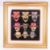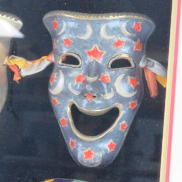 A montage of nine enamelled brass decorative masks mounted on black velvet with gold painted frame all measuring 74 x 76.5cm.