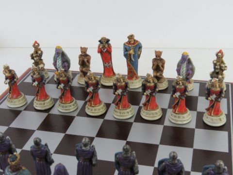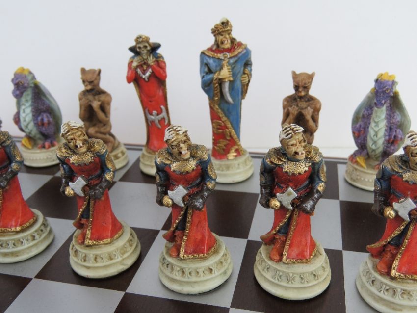 A hand painted good versus evil chess set in original packaging.