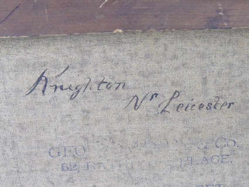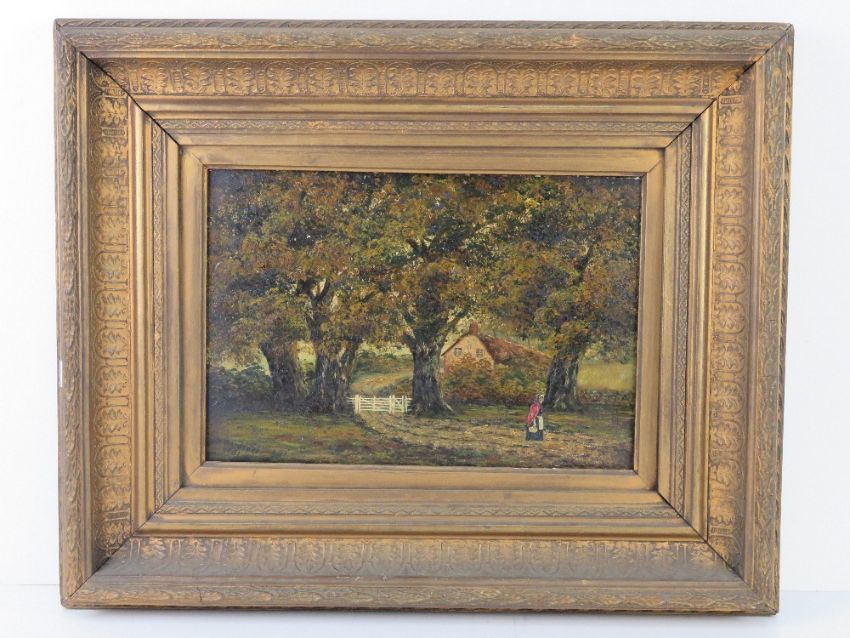 Oil on canvas of a country lane framed by trees with white gate leading to a thatched farmhouse, lady in shawl with wicker basket to foreground. Signed lower left IW Gardiner 1881, titled verso Knighton Nr Leicester in gilded, wooden frame, Site size 31.5 x 21.5, overall size 53 x 43cm.