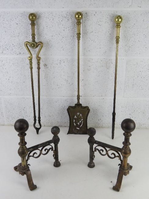 A five piece large brass fireside companion set comprising poker, tongs, shovel and pair of firedogs.